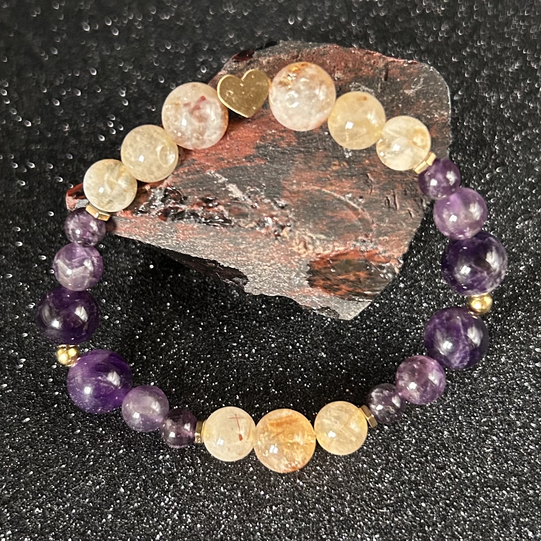 Citrin spodbuja optimizem, obilje in življenjsko energijo, ametist pa prinaša mir, jasnost in duhovno povezavo.